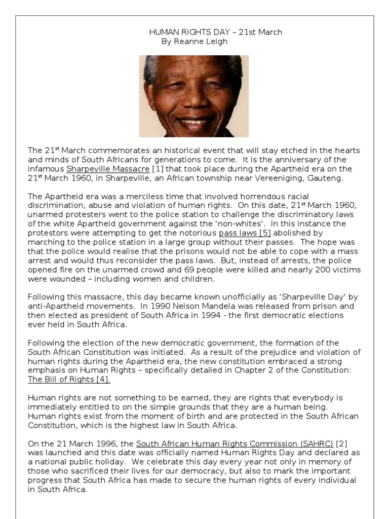 The holiday commemorates the establishment of the south african human rights commission sahrc. It is the most translated document around the world and is available in over 500 languages. Human rights day is a public holiday we take the day off. Please scroll down to end of page for previous years dates.