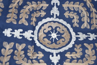 Printed in metallic silver and gold the fabric is weathered for a time softened effect.